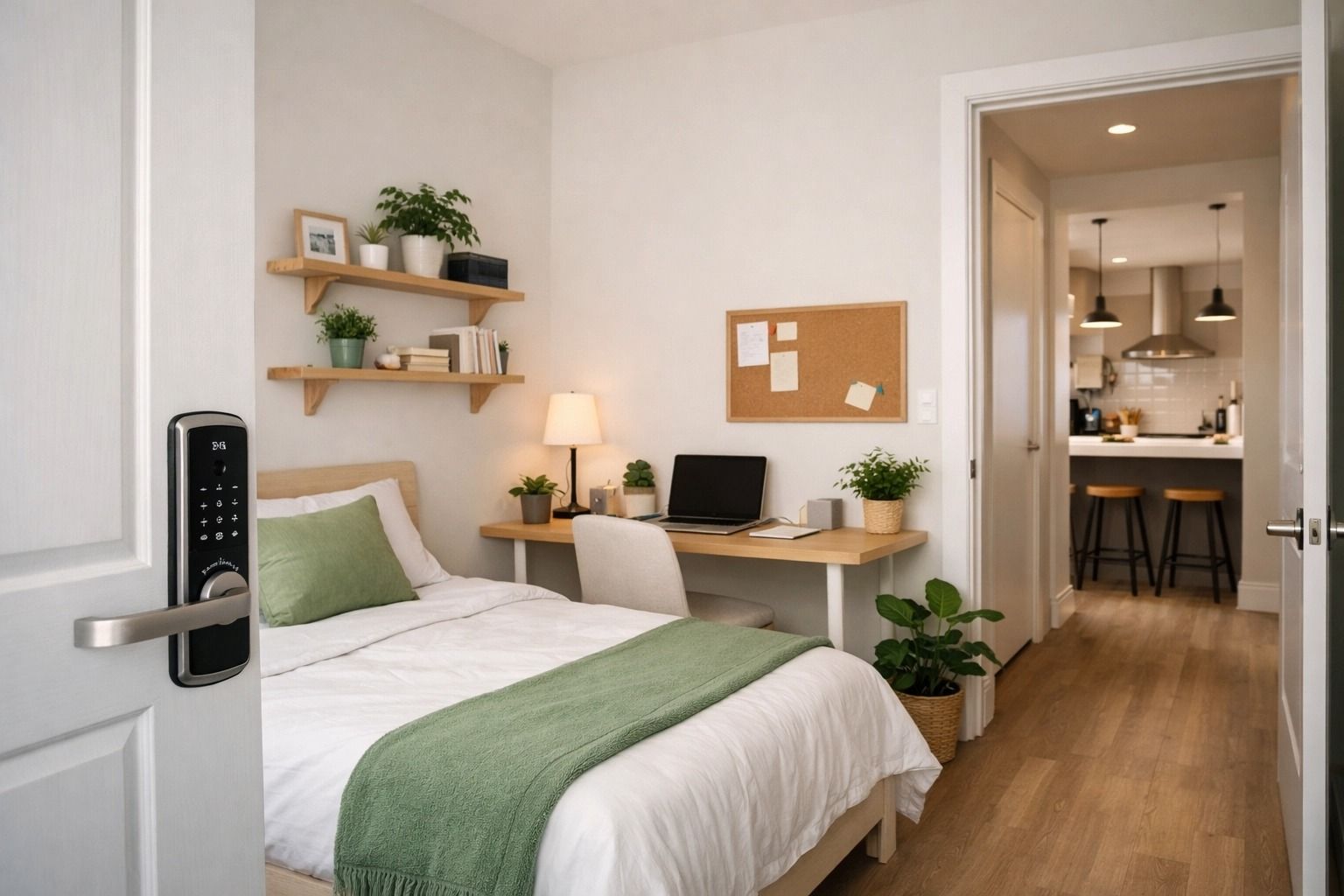 A private bedroom with a secure digital lock, fully equipped kitchen with modern appliances, in-unit washer and dryer, and professional cleaning every other week. All utilities and high-speed Wi-Fi are included.